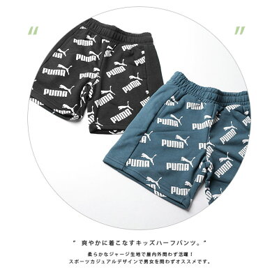 プーマのキッズハーフパンツ! ●PUMAロゴプリントの総柄と両サイドの切替えが特徴の裏毛スウェットショーツ! ●ウエスト調節紐、両サイドポケット付き。