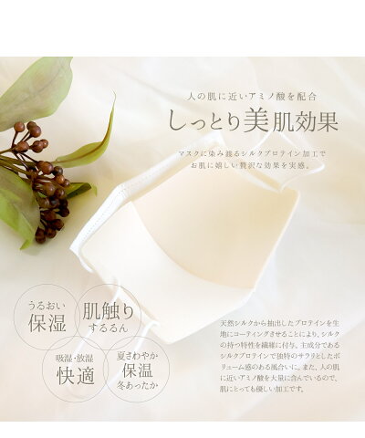 また、フィブロインは、人の肌に近いアミノ酸組成分と同様に21種類のアミノ酸を大量に含んでいるので、シルクの持つ保湿性・放湿性・保温性に優れた肌にやさしい素材です。