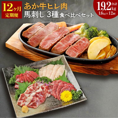 【ふるさと納税】【12ヶ月定期便 合計19.2kg】熊本県産 あか牛ヒレ肉 馬刺し 食べ比べセット ヒレ肉 合計12kg 馬刺し 合計7.2kg(赤身2.4kg・霜降り2.4kg・たてがみ2.4kg) ステーキ 牛肉 あか牛 食べ比べ 熊本県産 九州産 国産 冷凍 定期便 送料無料